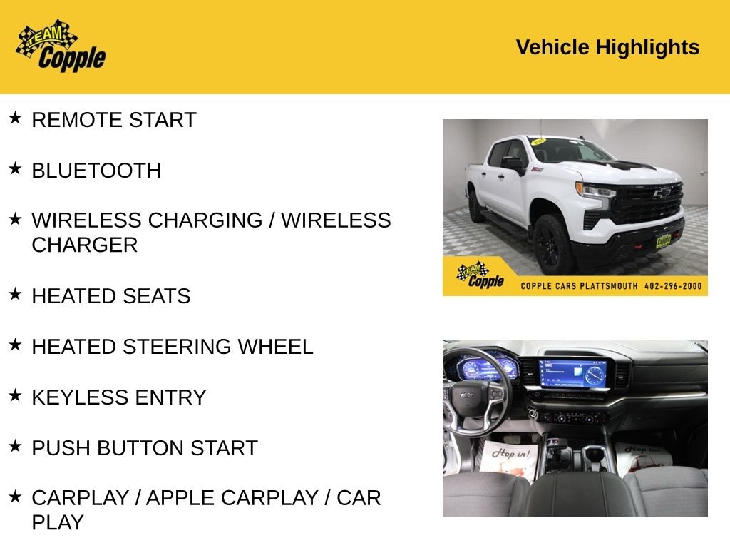 2023 Chevrolet Silverado LT Trail Boss 4WD crew cab truck for sale with a 5.3L EcoTec3 V8 engine, Z71 Off-Road Package with 2-inch lift, and Chevy Safety Assist including Automatic Emergency Braking, paired with a 13.4-inch touchscreen with Google built-in and wireless Apple CarPlay and Android Auto. This Silverado Trail Boss 4WD adds trailering capability with hitch guidance and an Autotrac 2-speed transfer case, combines Lane Keep Assist with Lane Departure Warning and Forward Collision Alert, and features a 12.3-inch digital driver information center with remote start and keyless open and start. Built as a crew cab short bed 4WD truck, it also integrates hill descent control and trailer sway control, along with IntelliBeam automatic high beams and heated front bucket seats with a heated steering wheel and dual-zone climate control.
